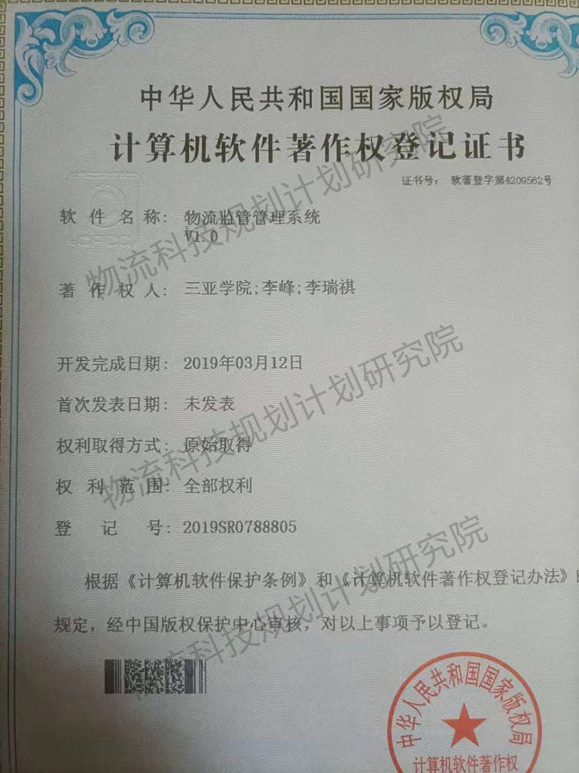 物流監(jiān)管管理系統(tǒng)V1.0(證書號:第4209562號)